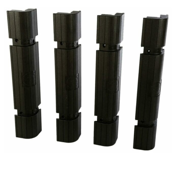 The set includes four black corner units. Optional straps available. Also available in high-visibility yellow. Mixing black and yellow enhances contrast and driver awareness.